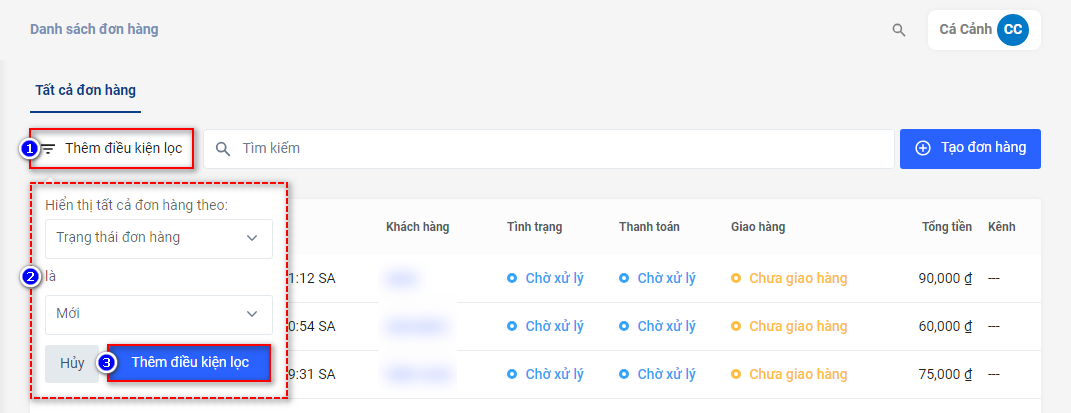 Để lọc đơn hàng, Nhà bán hàng nhấp vào Thêm điều kiện lọc > chọn bộ lọc > Thêm điều kiện lọc.