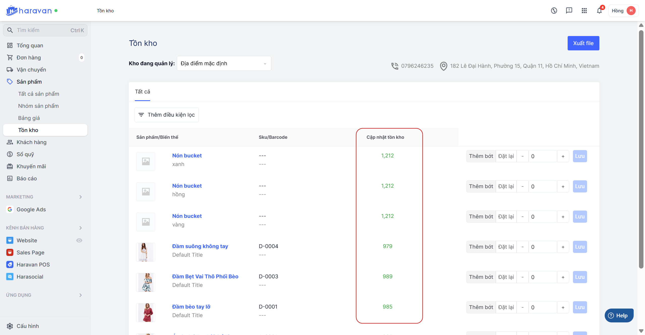 Bạn có thể thực hiện việc cập nhật tồn kho tại trang chi tiết sản phẩm và tại trang Tồn kho